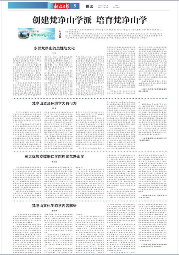 7月25日,beat365召开了创建梵净山学派培育梵净山学研讨会,与会专家、学者就紧紧围绕梵净山进行学科专业建设,着力念好山字经,努力创建梵净山学派、培育梵净山学,全力推动梵净山学的形成和发展等提出了真知灼见,形成了《永葆梵净山的灵性与文化》《梵净山资源环境学大有可为》《梵净山文化生态学内容解析》《三大优势支撑beat365英国官方网站构建梵净山学》等研讨文章,在《铜仁日报》等媒体平台整版刊出。