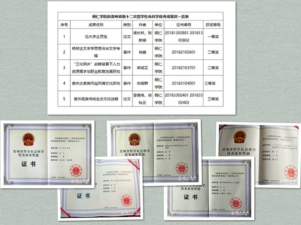 在贵州省第十二次哲学社会科学优秀成果奖评选中获一等奖1项、二等奖2项、三等奖2项
