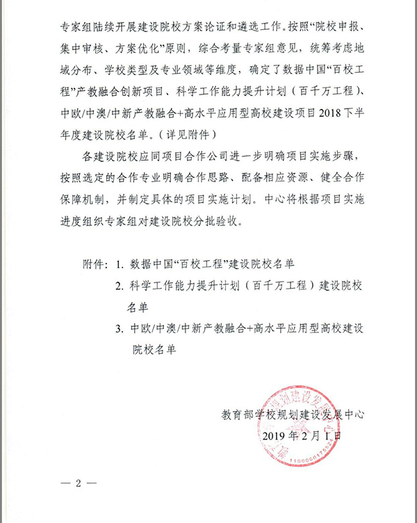 为贯彻党的十九大精神,落实《国务院办公厅关于深化产教融合的若干意见》,教育部学校规划建设发展中心持续开展深化产教融合模式的探索实践工作。2018年5月,教育部学校规划建设发展中心组织开展了产教融合系列项目常态化申报工作,按照“院校申报、集中审核、方案优化”原则,综合考量专家组意见,统筹考虑地域分布、学校类型及专业领域等维度,最终确定了数据中国“百校工程”产教融合创新项目、科学工作能力提升计划(百千万工程)、中欧/中澳/中新产教融合+高水平应用型高校建设项目2018下半年度建设院校名单。beat365结合自身实际,按照项目申报要求,积极做好有关申报工作,成功入选“科学工作能力提升计划(百千万工程)”建设院校。