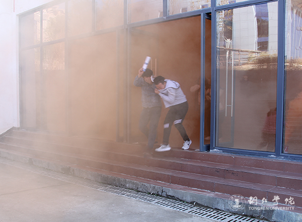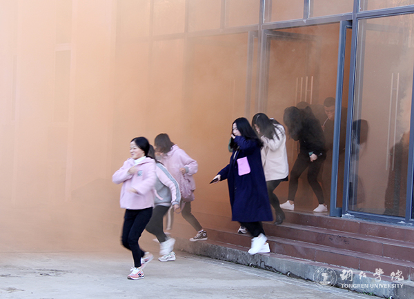 下午四点,实验楼内瞬间充满了浓浓的橘红色烟雾,随即警铃呼呼作响,学校保安迅速到位,指导学生快速疏散。教室内的同学沿着预定的逃生路线有序撤离,他们用手捂住口鼻,弯腰降低身体重心,快速地跑到实验楼的广场上列队。学生集合完毕后,各班派代表向活动组织人员汇报疏散情况、报告人数。整个演练过程快而不乱、没有推搡等不良现象。