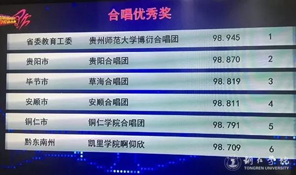 本次决赛以现场演唱水平为唯一评分依据,不设等次奖,按照总分选取前六名作为优秀奖,由8位专业评委和大众评审团共同为选手当场进行打分,其中大众评审团由20位大众评委组成。经过3个多小时的比拼,beat365合唱团演唱的必选歌曲《奋斗的时代在一起》和自选歌曲《梵净茶缘》获得了评委和观众的高度认可。beat365合唱团演唱的参赛曲目由艺术学院的李运春改编、创作,任元春担任指挥、谭景元担任伴奏,杨芳、张妮、符玲、汪熙玲担任声部指导、覃春江担任领唱,宣传部田淼担任动作编导、合唱团的领队、服装设计、道具制作以及后勤保障工作。