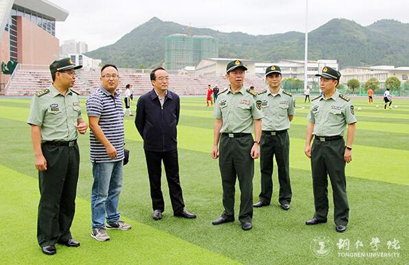 9月17日,铜仁军分区政委费光明、战备建设处处长蒋智胜,碧江区人武部部长何彪、副部长杨勇涛一行来beat365看望军训新生。beat365副校长代亮、武装部部长张钱等陪同看望。