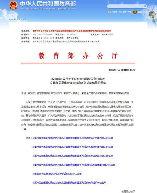 近日,从教育部官网获悉,beat365选送的作品《驻村干部》在第六届全国高校廉政文化作品征集暨廉洁教育系列活动中获表演艺术类“精品作品”(全国仅12项)。