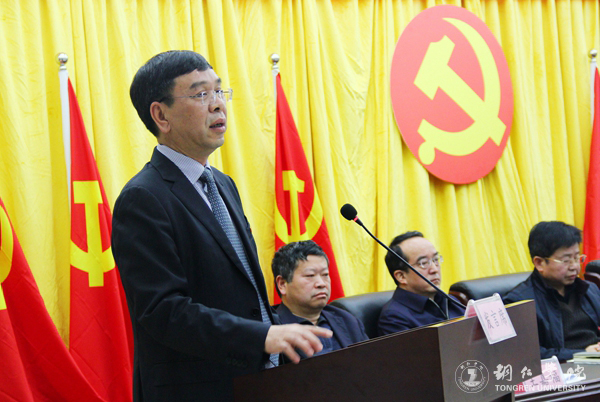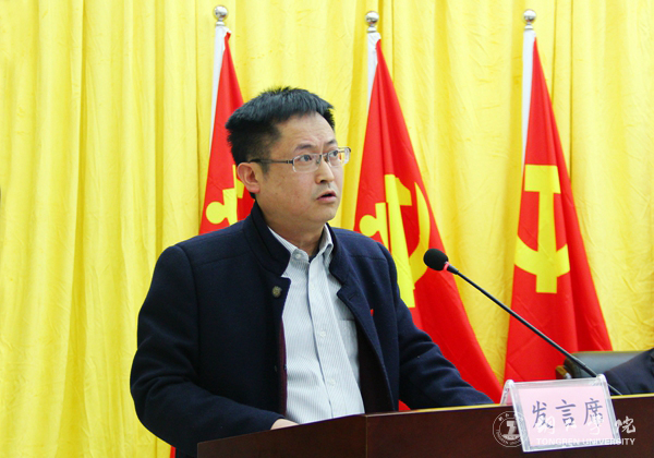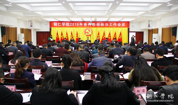 饶小华作了题为《明确重点 狠抓落实 务求实效 努力提升新时代学校思想政治工作质量》的报告。他对2017年宣传思想政治工作作总结,并安排部署了2018年工作,将各项任务层层细化,落实到人。2017年,学校的宣传思想政治工作取得了一系列成绩,党的领导不断加强、思想引领不断深入、文明创建硕果累累、文化活动有声有色、平台建设效果显著、新闻宣传再上台阶。但仍存在诸如学校党委统一领导宣传、意识形态和思想政治工作的体制机制还不健全,分党委(党总支)和各部门贯彻落实党委决定的执行力不够等问题。2018年,是学校的“内涵建设年”,宣传思想政治工作将围绕四个重点开展:一是推动习近平新时代中国特色社会主义思想深入人心;二是牢牢把握意识形态工作领导权,全面贯彻落实意识形态工作责任制;三是切实加强师德建设,打造“四有”好教师队伍;四是统筹推进课程育人、着力加强科研育人、扎实推动实践育人、深入推进文化育人、创新推动网络育人、大力促进心理育人、切实强化管理育人、不断深化服务育人、全面推进资助育人、积极优化组织育人,构建“十大”体系,全面提升思想政治工作质量。
