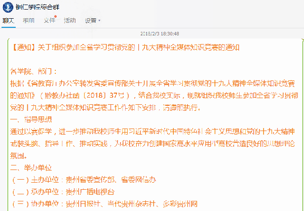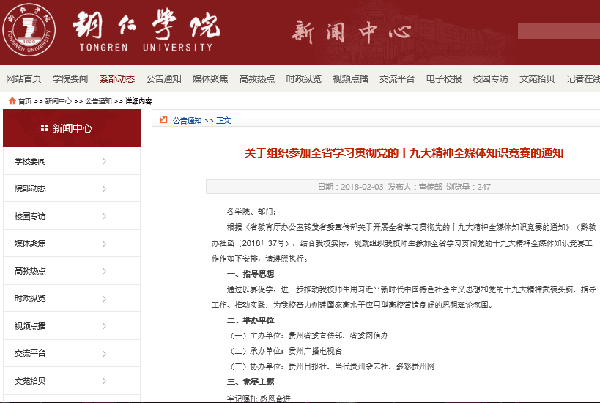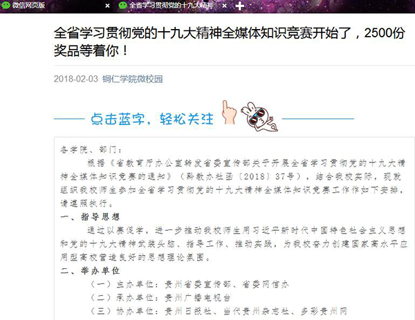 为巩固全省学习宣传贯彻党的十九大精神千团万场“大宣讲”成果,推动学习宣传党的十九大精神和习近平总书记在贵州省代表团的重要讲话精神向纵深发展,省委宣传部等六个部门联合开展了主题为“牢记嘱托 感恩奋进”党的十九大精神全媒体知识竞赛活动。beat365党委高度重视、认真落实此次知识竞赛,精心组织开展了为期六天的手机答题竞赛活动,全校师生积极参加。