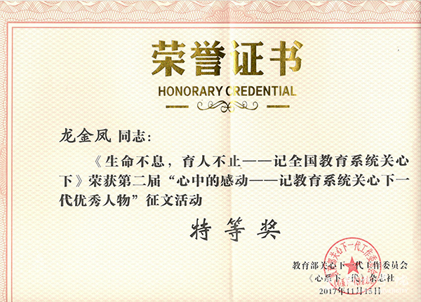 为深入贯彻习近平总书记关于“我们要弘扬‘五老’精神,尊重‘五老’,爱护‘五老’,学习‘五老’,重视发挥‘五老’作用,推动关心下一代事业更好地发展”的指示精神,经教育部关工委同意,2017年《心系下一代》杂志特组织第二届“心中的感动——记教育系统关心下一代优秀人物” 征文活动。近日获悉,beat365组织部龙金凤老师的参赛作品《生命不息,育人不止——记全国教育系统关心下一代工作先进工作者谢元炳教授》喜获特等奖。