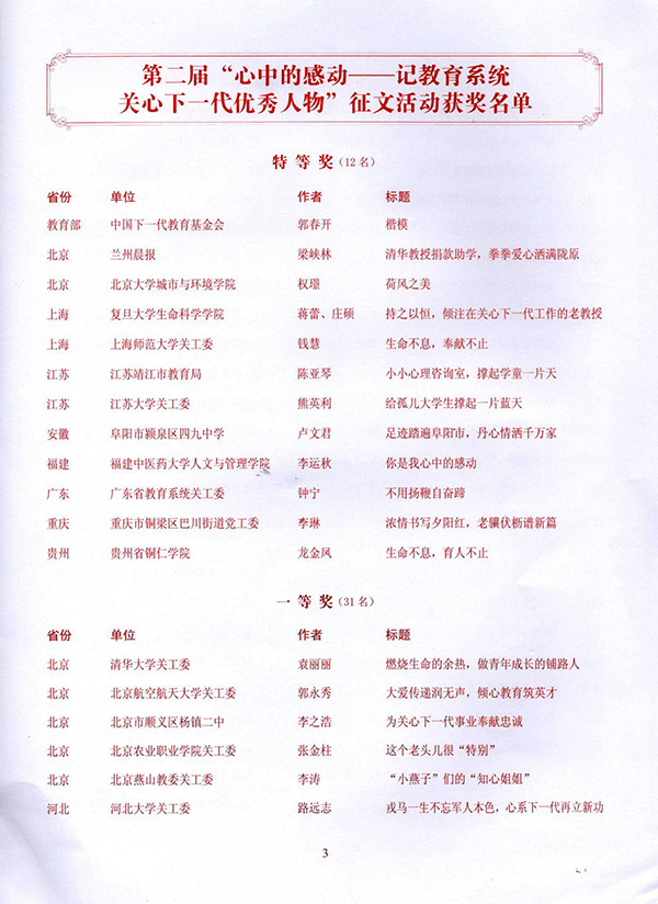 据了解,此次“心中的感动——记教育系统关心下一代优秀人物”征文活动,是希望通过各地区各学校及时发现、积极推介和大力宣传身边的“五老”典型事例,进一步弘扬关工委老同志的高尚风范,努力服务教育关工委事业创新发展。《生命不息,育人不止——记全国教育系统关心下一代工作先进工作者谢元炳教授》一文讲述beat365退休老教师、现任校关工委常务副主任的谢元炳教授在教育岗位上工作66年倾心育人的真实感人事迹,他离开领导岗位10余年来,热心地关爱下一代的成长成才,继续为发展beat365英国官方网站的教育事业不知疲倦地努力工作。据悉,本次获奖的文章将在教育部关工委网站和《心系下一代》刊登,并收录在编辑出版的《心中的感动》一书中。