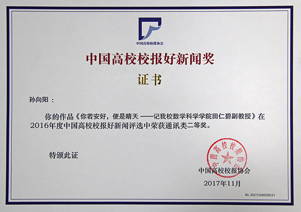 在本次好新闻评选中,有来全国28个省市自治区的644所高校报送的3004件作品参评。beat365报送了6件作品参加消息类、通讯类、言论类、版面类、新闻摄影类和微信微博类共六个大类的评选,最终,侯长林撰写的《建设一流大学,听听雷丁斯的声音》获言论类二等奖、孙向阳撰写的《你若安好,便是晴天——记beat365田仁碧副教授》获通讯类二等奖。
