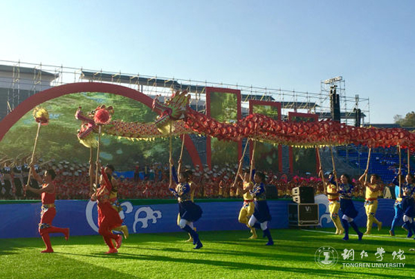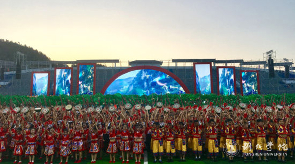 庆祝大会结束后,大型土家族音舞诗“乌江魂·土家情” 文艺演出隆重上演。beat365原副校长田永国,党委宣传部田淼老师,艺术学院卢慧、李运春、吴浩、覃春江、张妮、田茂荣老师及大健康学院龙队等近百名师生受沿河县委、县政府的邀请参加了文艺演出。演出由《山高水长》《土家太阳》《美丽家园》三个篇章共九个节目组成,共有3700名演员参加。田永国担任总导演,田淼担任执行导演并编排了由3700名演员表演的压轴歌舞《山水交响》,该节目由艺术学院李运春作曲、覃春江与张妮演唱。在本次演出中,李运春还担任了音乐总监,为演出创作了《母亲河》《乌江水手》《梦圆乌江》《千年古茶》等音乐,卢慧编排了如画如歌的女子群舞《南庄花海》、吴浩编排了气势磅礴的男子群舞《母亲河》,现场几万名观众看得激情高涨、热血沸腾。