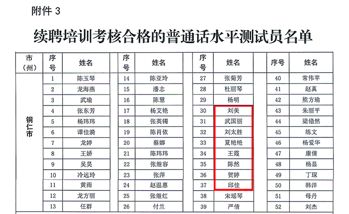 日前,贵州省教育厅办公室公布了全省普通话水平测试工作规范化检查及续聘考核结果,beat365机测点通过检查,刘美、武国丽、刘太胜、夏艳艳、王霞、陈然、贺婷、邱佳等8位测试员续聘培训考核合格。