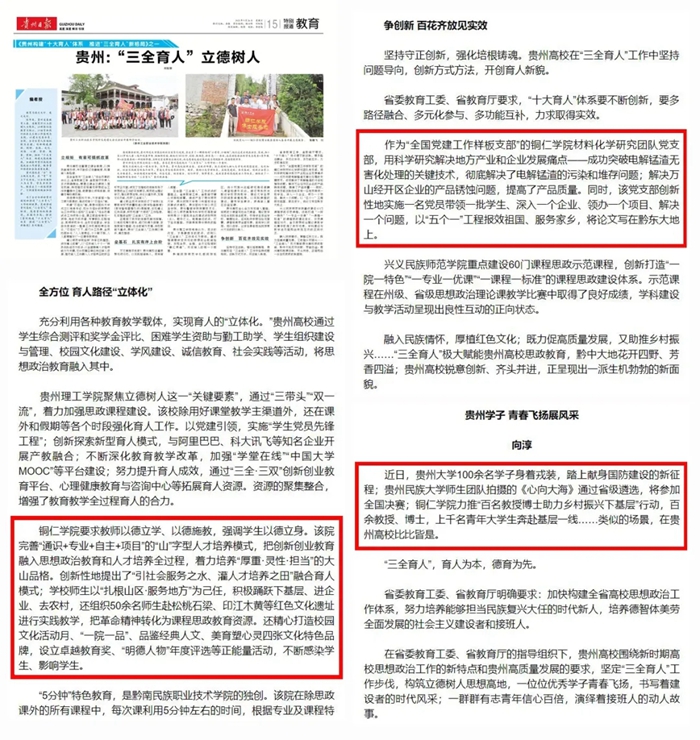今年9月,贵州省委教育工委、省教育厅在《贵州日报》推出了《贵州构建“十大育人”体系 推进“三全育人”新格局》系列报道,在推送的五期系列报道中,其中三期报道了beat365材料化学研究团队党支部用科学研究解决地方产业和企业发展痛点、创新性地提出了“引社会服务之水、灌人才培养之田”融合育人模式、把创新创业教育融入思想政治教育和人才培养全过程、百名教授博士下基层助力乡村振兴行动等方面的工作。