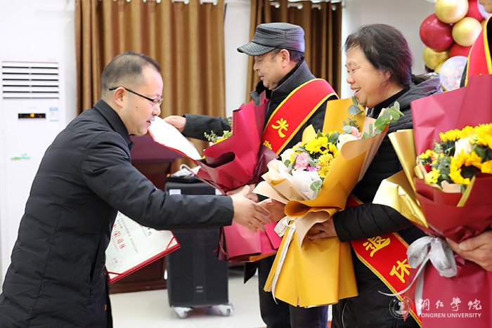 会上,播放了退休教职工工作业绩成果介绍视频;代亮、石维为退休教职工颁发了荣休证书;志愿者向退休教职工献花;退休职工代表向青年职工代表授予了“传承铜院精神 展现青春担当”红旗。