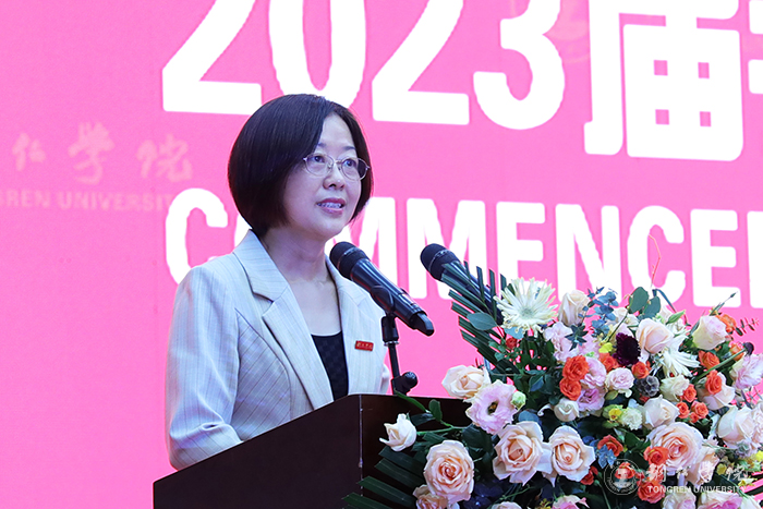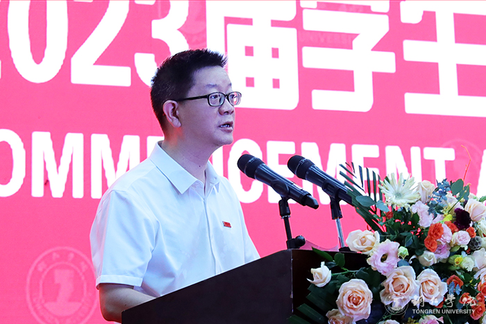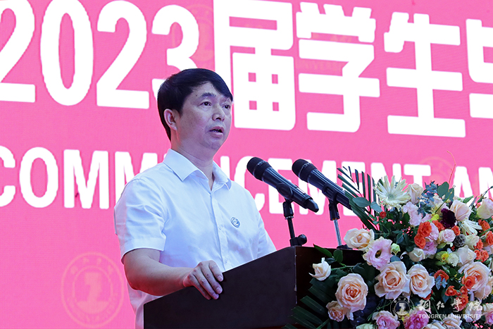 毕业典礼上,朱洪波作了题为《潮起海天阔 扬帆正当时》的讲话。他代表学校向同学们表示热烈祝贺,为同学们即将踏上新的征途送上美好祝福,同时,向付出了辛苦努力的全体教职员工表示诚挚敬意。他说,同学们在beat365英国官方网站求学生活的四年里,秉持“明德·致用”的校训精神,度过了人生最美好、最宝贵、最值得留恋的青春岁月;弘扬“尚贤尚能”“善思善行”的校风学风,淬炼成长,修身治学,坚毅前行,与母校共成长同发展;与伟大祖国和伟大时代同向同行,体现了新时代大学生的精神风貌。他提出了三点期盼,与同学们共勉。一是要树牢理想信念,把准人生航向。同学们要牢固树立马克思主义信仰、共产主义和中国特色社会主义的信念,把自身的成长融入国家社会进步的历史洪流之中。二是要胸怀远大志向,勇担历史使命。同学们要胸怀为中华民族伟大复兴建功立业的远大志向,培育优秀品质,练就过硬本领,为国家富强、民族振兴贡献力量。三是要坚持终身学习,做到学以致用。同学们要树立终身学习理念,永远保持昂扬向上的学习热情,使自己的思维视野、思想观念、认识水平跟上时代发展步伐。他希望同学们要以激扬青春的豪情、以舍我其谁的担当,以梦为马,不负青春,不负韶华,在波澜壮阔的时代画卷中奏响澎湃的青春之歌,在以中国式现代化推动中华民族伟大复兴的伟大征程上建功立业。