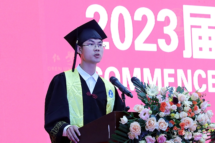 老挝籍留学生代表、经济管理学院小龙,用标准流利的中文说,五年前,不会说中文的自己怀揣着憧憬,在这片有14亿人口的土地种下了希望。时节如流,希望长出了枝桠,自己的人生也绽放出第一朵花。现在毕业了,特别感谢学校,还要感谢中国。将来会再次来到中国,来看望老师,看望母校,也将会告诉自己的孩子:“去吧,去中国读书,去看看世界吧。”