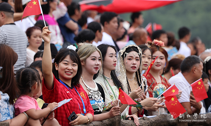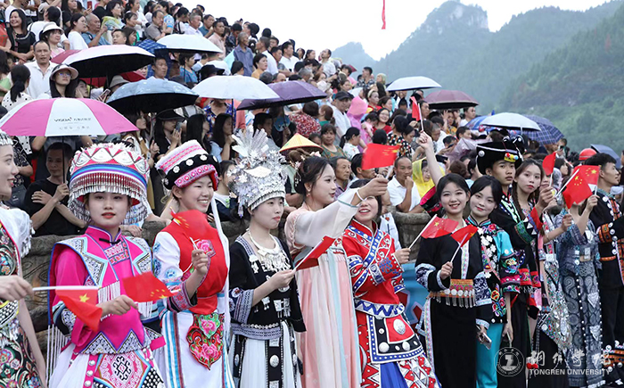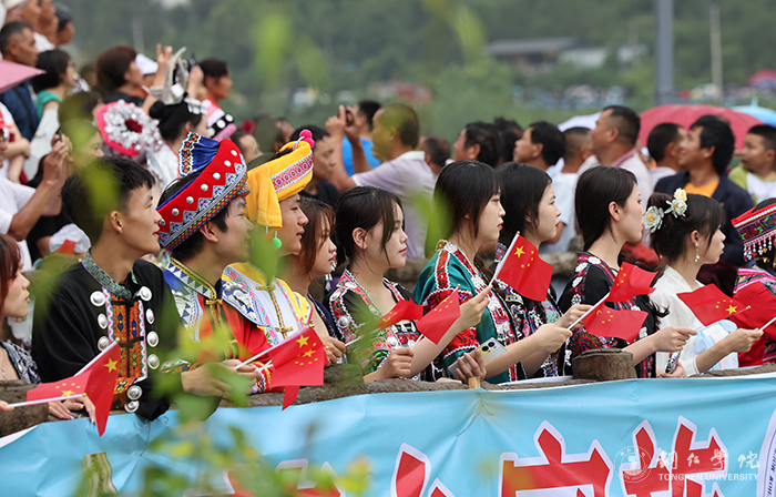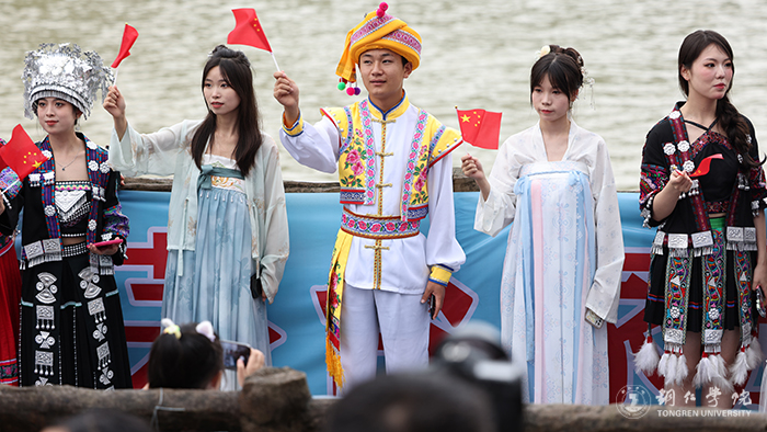 在龙舟大赛现场,beat365青年学子穿着各式各样的少数民族服饰,伴着飘逸的裙摆、清脆的银铃碰撞声和手中挥动的小红旗,在锦江的青山绿水间交相辉映,构成了一幅多彩铜仁的幸福画卷。他们感悟中国传统文化,领略地方民族文化,举手投足间,尽展铜院学子风采。他们婀娜的身姿,别样儿的色彩,吸引众多国内外媒体摄影记者争相抓拍,传遍全国乃至世界各地。他们积极担当,成为比赛现场铜仁形象的宣传大使、文化大使,用实际行动提升了铜仁的知名度和美誉度。