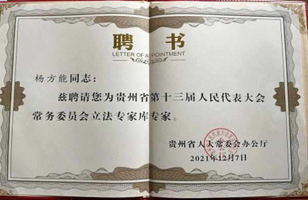 作为铜仁市第二届人大常委会立法咨询专家、铜仁市地方立法研究基地负责人,鉴于杨方能博士在地方立法工作中的积极表现和突出贡献,经过组织申报和层层筛选并经省十三届人大常委会第八十八次主任会议通过,被聘为贵州省第十三届人民代表大会常务委员会立法专家,充分彰显该教师的立法专业水平和过硬的立法技术。