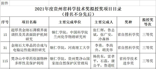 近日,贵州省科技厅对2021年度省科学技术奖评审结果进行公示,beat365共获得3个奖项。其中,beat365张仁辉教授等申报的《超厚类金刚石薄膜界面调控及其表面防护机制研究》和李勇教授等人申报的《金刚石大单晶的合成与电输运性能调控研究》获得贵州省自然科学奖三等奖,杨传东等申报的《梵净山中草药资源物种多样性及保护利用》获得贵州省科学技术进步奖三等奖。