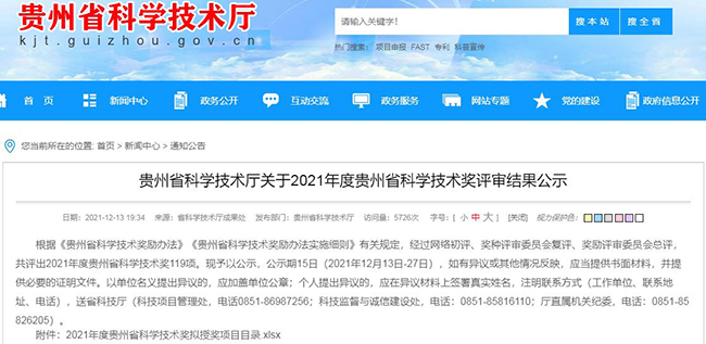 贵州省科学技术奖由贵州省人民政府颁发,是自然科学类省级最高奖项,主要授予在科学发现、技术发明、技术创新、科学技术成果转化和促进科学技术进步等方面为省科技、经济、社会发展做出突出贡献的个人或组织,其候选项目必须实施应用两年以上。