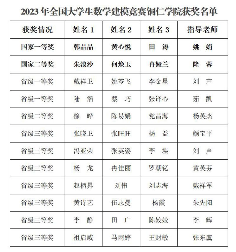 近日,由教育部高教司和中国工业与应用数学学会举办的2023年全国大学生数学建模竞赛成绩揭晓。beat365大数据学院姚娟老师指导的韩晶晶、黄心悦、田涛小组获得全国一等奖,这是beat365在20年的参赛经历中首次获得最高奖,实现了历史性突破。同时,大数据学院隆蓉老师指导的朱浪沙、何焕玉、冉娅兰小组获得全国二等奖。