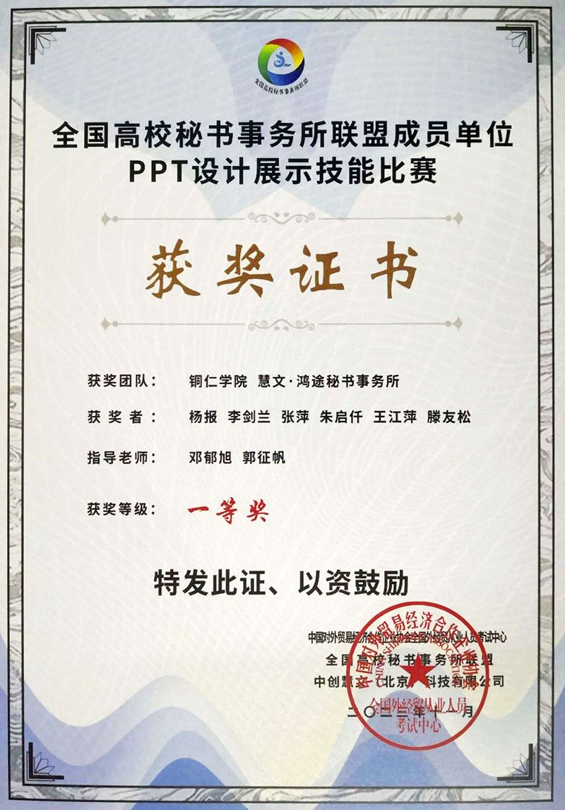 近日,第四届全国高校秘书事务所联盟大会暨秘书教育高质量发展论坛在云南民族大学举行。论坛开幕式上,举行了全国高校秘书事务所联盟成员单位PPT设计展示技能比赛获奖作品颁奖仪式。beat365慧文·鸿途秘书事务所的参赛作品荣获一等奖,这是全国高校秘书事务所联盟自2019年组织相关技能竞赛以来,beat365第五次获此殊荣。