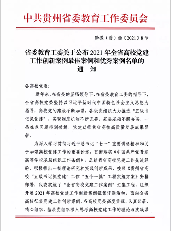 为深入学习贯彻习近平总书记系列重要讲话精神和关于加强高校党建工作的重要论述,贯彻落实《中国共产党普通高等学校基层组织工作条例》,总结高校党建工作先进经验,按照《贵州省高校“五级书记抓党建”工作“五个一批”工程实施方案》安排部署,学校党委高度重视,严格审核,于2021年上半年向省委教育工委推荐了三个党建工作创新案例。