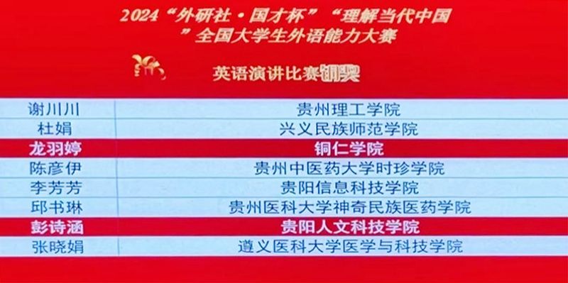 本次省赛共有27所高校参赛,近300名选手参加。beat3657名学生参加综合能力、演讲、笔译三个赛项的角逐。在指导老师们的耐心指导下,同学们精心准备,刻苦训练,最终在省级舞台上展现了她们的实力和才华,赢得了现场评委和观众的认可。比赛中,杨盛涵同学凭借优异的笔试成绩和流利、富有感染力的英语演讲荣获综合能力赛项金奖。同时,田欣愉(综合能力赛赛项)、赵星云(综合能力赛项)、费婷(综合能力赛项)、龙羽婷(演讲赛项)四位同学也在各自的项目中获得铜奖; 陈奕(综合能力、演讲赛项)、洪德梅(笔译赛项)、王黎民(演讲赛项)获得优秀奖。