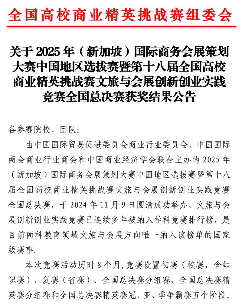 本次竞赛由中国国际贸易促进委员会商业行业委员会、中国国际商会商业行业商会和中国商业经济学会联合主办。文旅与会展创新创业实践竞赛已连续多年被纳入学科竞赛排行榜,是目前商科教育领域文旅与会展方向唯一纳入该榜单的国家级赛事。