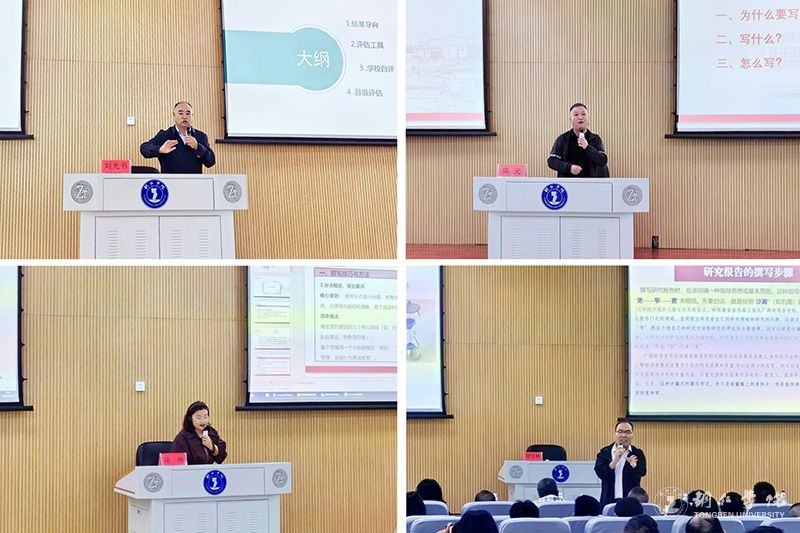 研修会首日围绕“一书四报告”(项目验收申请书、特色优势发展专题报告、教育局自评报告、项目学校自评报告及质量发展报告)展开系统讲解,五位专家分别就不同模块进行精准指导。陆艳博士强调《子项目I/II评估验收申请书》应图文表结合,突出学校特色,紧密对接政策,强化数据与案例支撑,并建议借助人工智能优化表达逻辑;陈元博士指出《项目学校特色优势发展专题报告》需聚焦特色领域,构建逻辑清晰的实践体系,注重案例的故事化表达与格式规范,增强可读性与说服力;董世华博士针对《教育局自评报告》与经费审计部分,强调严格对标省级文件,做到“对单清点”,确保任务落实与经费使用的规范透明;刘光书教授与刘方林博士则分别就《项目学校自评报告》和《质量发展报告》提出结构完整、数据详实、问题导向等要求,强调体现“监测—评估—改进”的质量闭环,全面覆盖从量化指标到质性案例的呈现。