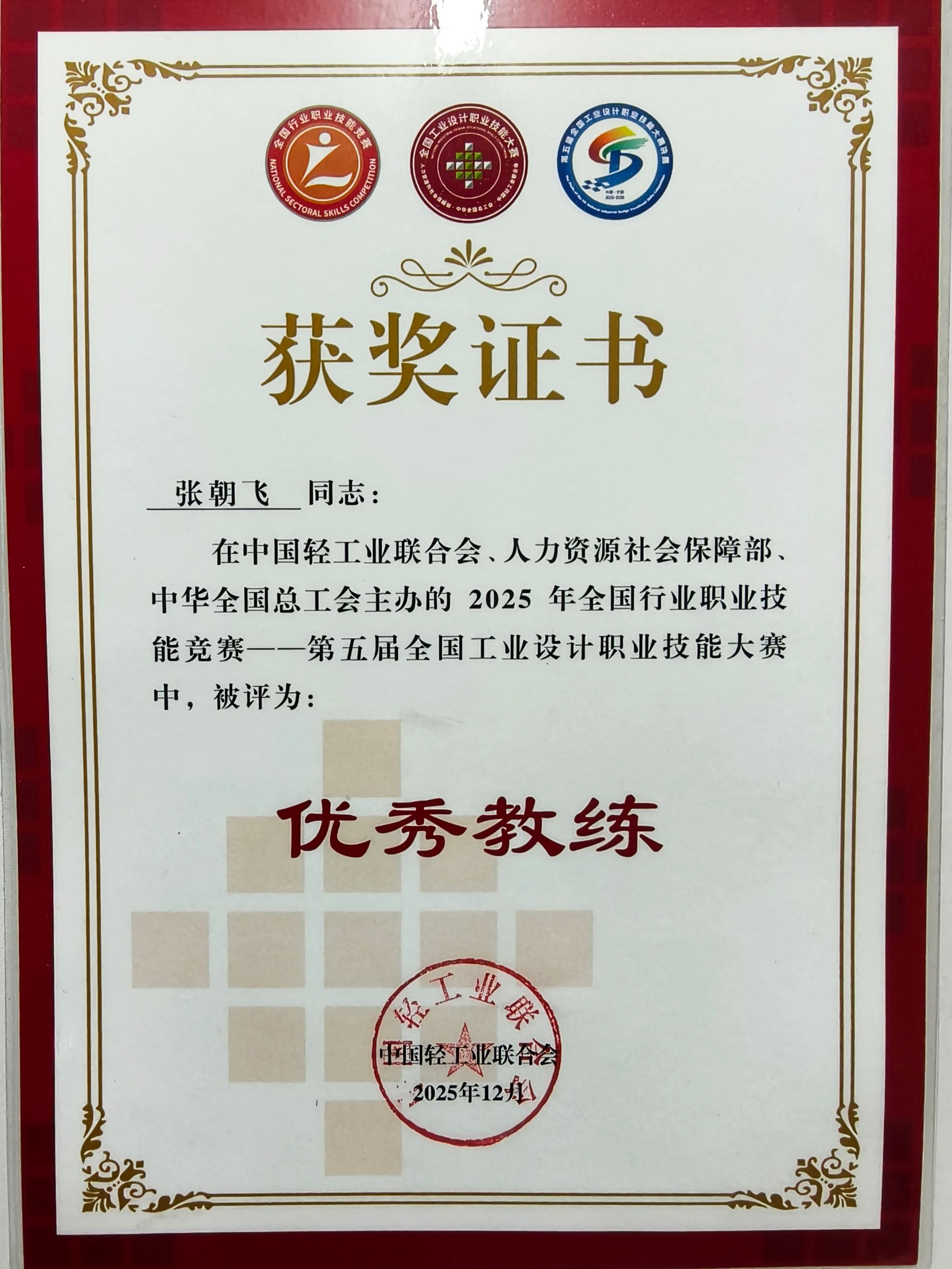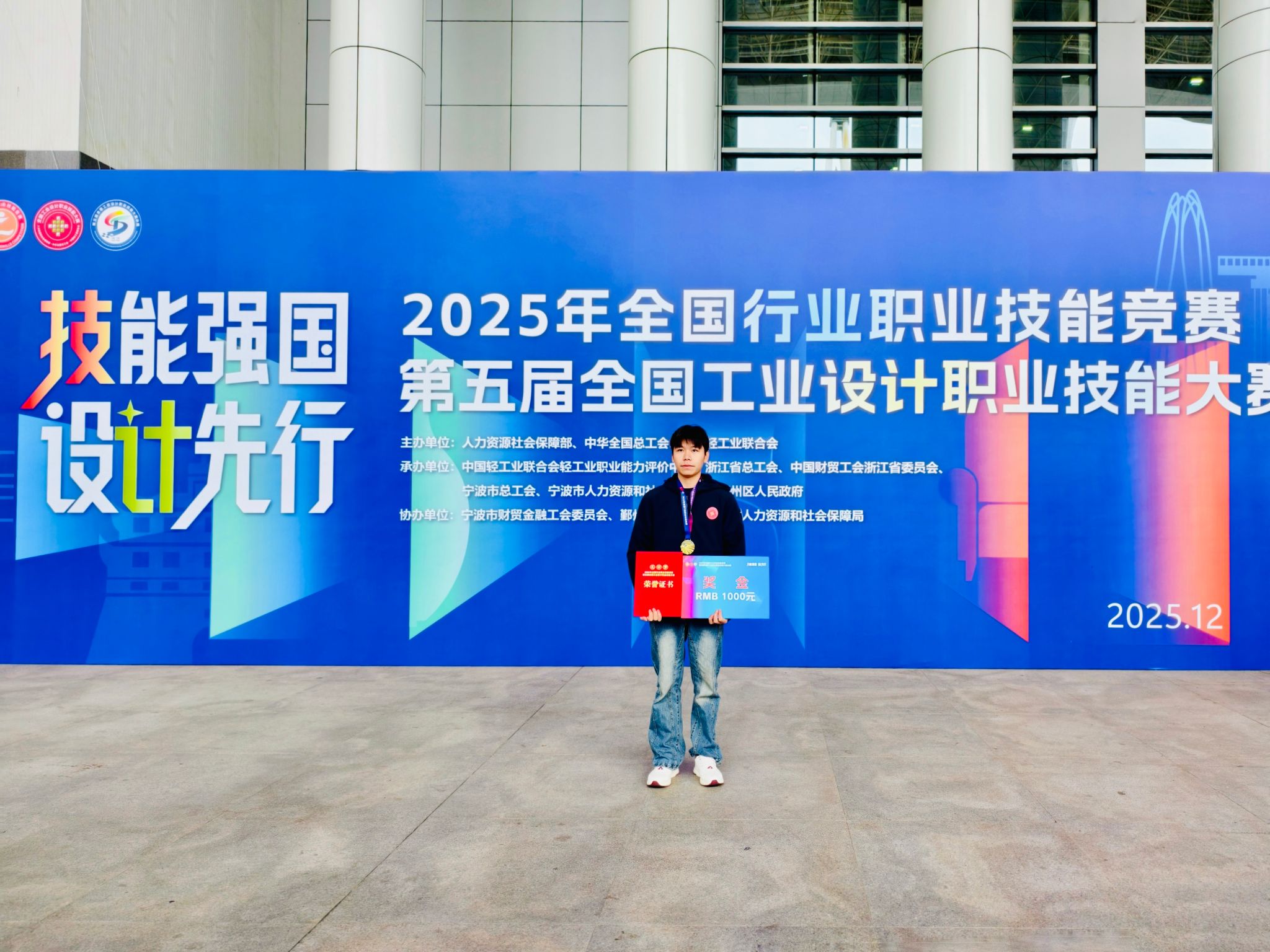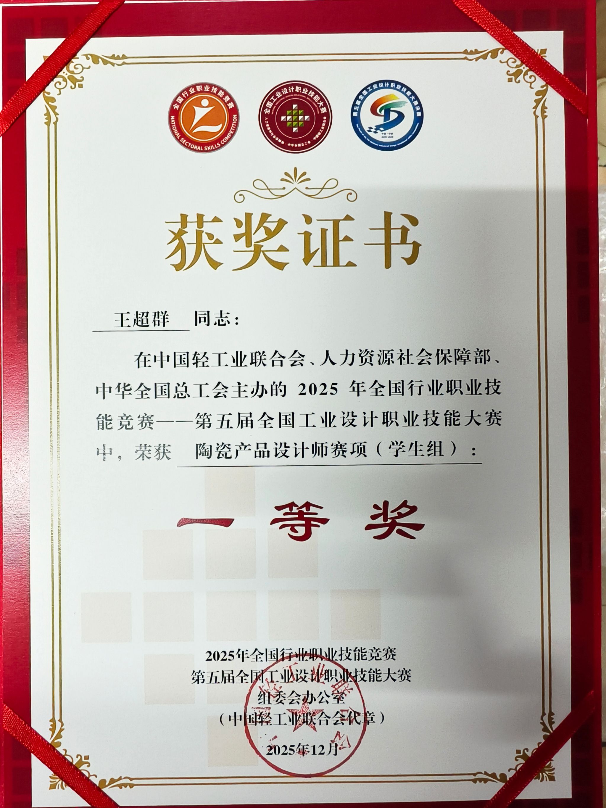 12月9日至12日,由人力资源和社会保障部、中华全国总工会、中国轻工业联合会共同主办的“2025年全国行业职业技能竞赛——第五届全国工业设计职业技能大赛决赛”在浙江宁波举行。来自全国各地的工业设计精英齐聚一堂,在这场国家级的技能盛会上展开激烈角逐。beat365农林工程与规划学院23级园林专升本2班学生王超群,凭借扎实的专业功底、创新的设计理念和精湛的实操技能,在陶瓷产品设计师赛项中脱颖而出,荣获一等奖;其指导老师张朝飞因出色的指导成效,被评为“优秀教练”。