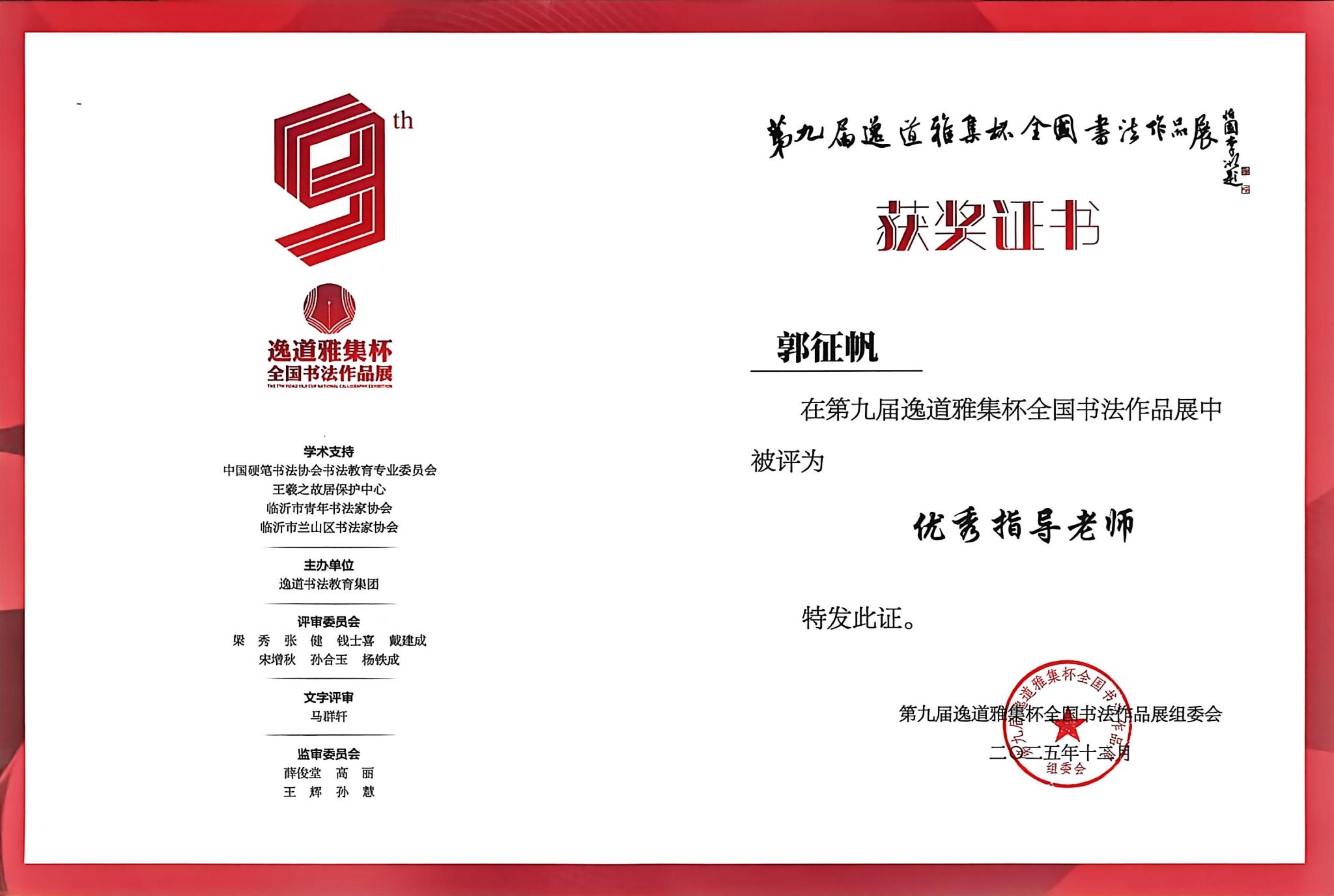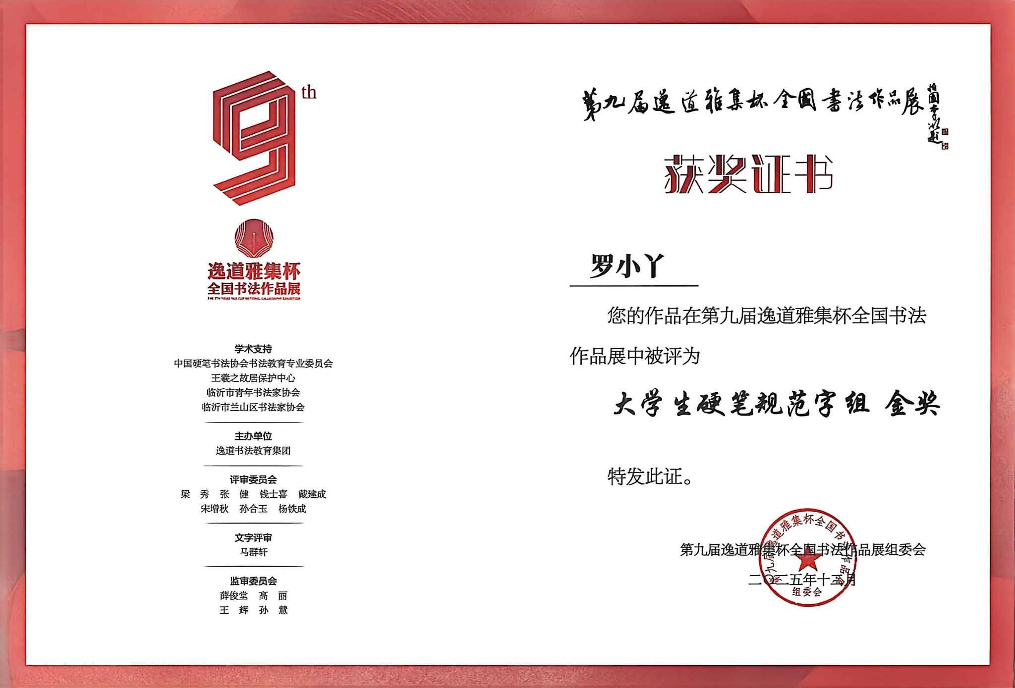 近日,第九届“逸道雅集杯”全国书法作品展评选结果揭晓,beat365秘书学专业师生在全国众多参赛作品中脱颖而出,荣获1项金奖、1项银奖、3项铜奖、4项佳作奖,同时1人荣获“优秀指导老师”称号,用笔墨实力彰显了高校书法教学与语言文字规范推广的成果。