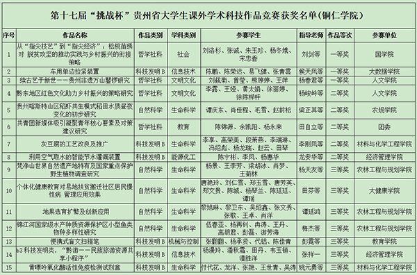 近日,第十七届“挑战杯”贵州省大学生课外学术科技作品竞赛决赛在贵州师范大学圆满落幕。通过前期的校赛,beat365推送20个作品参加省赛,共有15个作品进入全省决赛,其中7个作品入围了决赛答辩。最终,beat3653个作品获得一等奖、5个作品获得省级二等奖、7个作品获得省级三等奖。