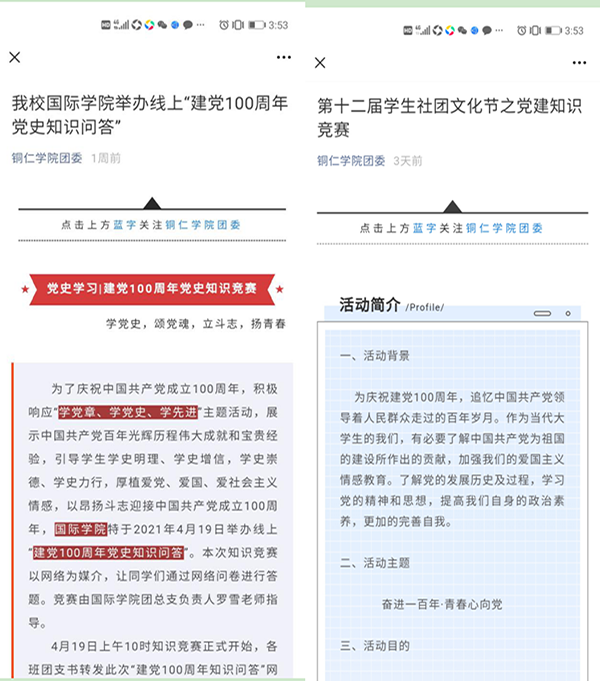 一是以“创作式”拓宽党史学习教育“广度”。为使青年大学生积极参与党史学习教育,营造良好的党史学习教育氛围,团委利用“线下创作、线上推送”相结合的形式,强化青年大学生党史学习教育的主体感及参与感。在“beat365英国官方网站团委”官方微信公众号及校内团属微信公众号开设了“铜院青年学党史·百年党史天天学”“党史百年天天读”“学史力行”“写给党的三行情诗”“党史微课云接力”等专栏,推送了专栏学习资料100余期,得到了广大青年学生的积极参与。在抖音短视频平台发布党史学习教育、党史学习教育校园随机街访相关视频4个,累计观看量近7万次。