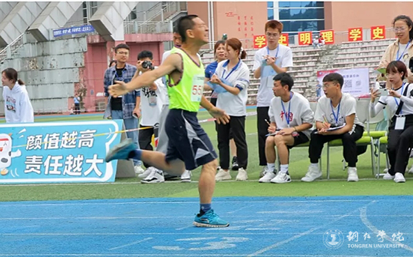 在此次运动会上,教职工竞赛以年龄段分为A、B、C三组,共有5个项目:100米、4*100米、女组200米和男组400米、铅球、跳远。运动会上,教职工们兴趣盎然,认真进行热身等赛前准备。在进行短跑比赛项目时,教师们一个个整装待发,当枪声响起的那一刻,风一般的速度掠过蓝色跑到;场下各个学院的学生为自己院的老师呐喊助威,运动会十分热闹。在进行4*100米项目时,比赛异常激烈,参赛队员一个个精神抖擞,他们的团结友好、恰到好处的默契赢得了比赛更赢得了全场的欢呼。在大家的共同瞩目下,教师们依次进行了跳远和铅球项目。每一个比赛项目,不仅锻炼了大家动手和动脑的能力,还锻炼大家在工作中能够团结协作的精神,这是智慧和体力的角逐,也是团结协作的比拼。