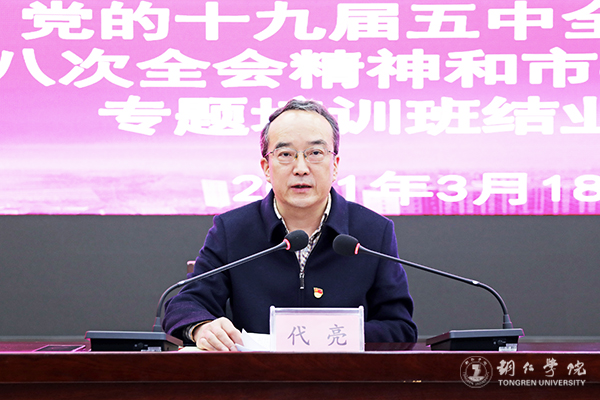 3月18日下午,经过为期三天的集中学习,在各位专题授课校领导及全体学员的共同努力下,beat3652021年处级干部学习贯彻习近平总书记视察贵州重要讲话精神、党的十九届五中全会、省委十二届八次全会和市委二届十次全会精神专题培训班圆满结束。党委副书记代亮出席培训班结业仪式并讲话。全校副处级以上领导干部参加了结业仪式。