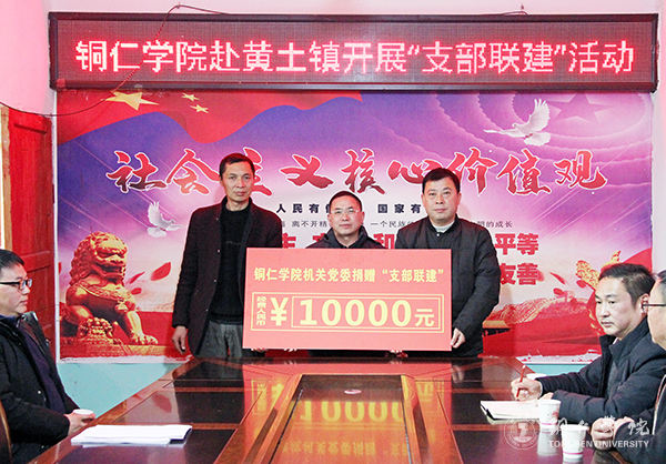 活动中,梁正海上了一堂微党课,向大家宣讲了贵州省委十二届八次全会精神,及时将上级党组织的精神传达到基层一线。活动中,举行了“支部联建”党支部党员活动室标准化建设经费捐赠仪式,beat365向双龙村、竹园村捐赠了20000元,其中机关党委捐赠10000元、艺术学院党委和材化学院党委各捐赠5000元。beat365还在黄土镇挂牌建立了“农家书屋”,捐赠了图书2260册、书柜8个。
