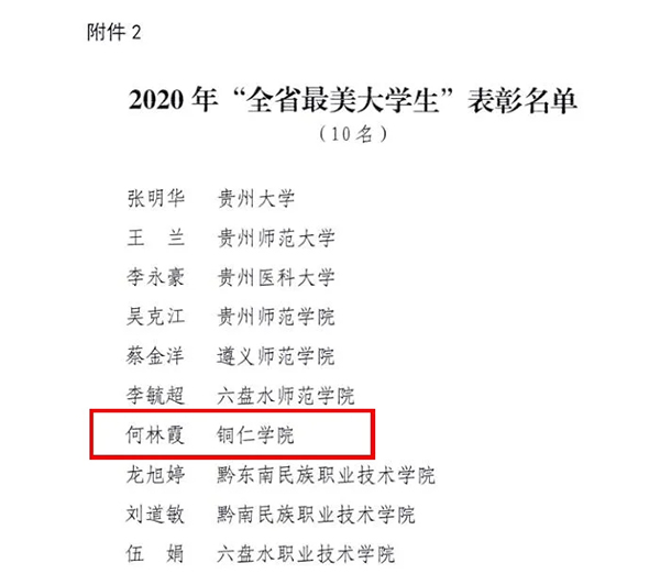 近日,省委宣传部、省委教育工委、省教育厅联合发布了《关于公布2020年贵州省“最美高校辅导员”“最美大学生”“最美乡村教师”评选结果的通知》,共评选出了10名“最美高校辅导员”、10名“最美大学生”、10名教师个人及1个支教团队为“最美乡村教师”。其中,beat365大数据学院2016级数学与应用数学1班学生何林霞(2020年6月毕业)被评为2020年“全省最美大学生”。