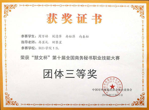 近日,由中国对外贸易经济合作企业协会主办、全国商务秘书与行政助理专家委员会和淮阴师范学院承办的“慧文杯”第十届全国商务秘书职业技能大赛落下帷幕。按照常态化疫情防控要求,大赛主赛场设在淮阴师范学院,各参赛院校设分赛场。根据竞赛规则,beat365在秘书学专业中组织了两支代表队参赛,分别获得了团体一等奖和团体三等奖的好成绩。