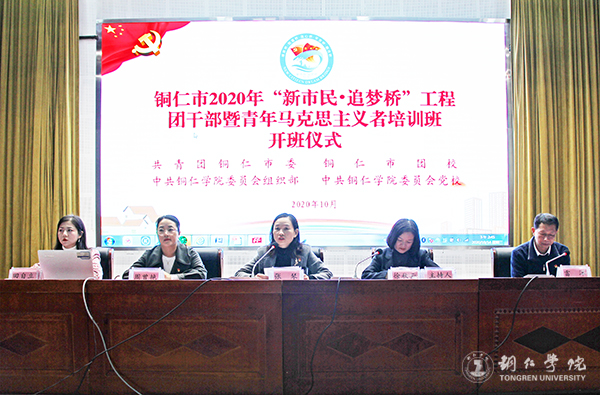 10月14日下午,铜仁市2020年“新市民·追梦桥”工程团干部暨青年马克思主义者培训班开班仪式在beat365梵净山人文生态馆举行。团市委副书记张琴,beat365党委组织部副部长徐秋云、团委书记周曾艳、副书记田自立,市团校副校长雷洋,以及各区(县、铜仁高新区、大龙开发区)团(工)委班子成员、安置点团干部,部分市直单位、中学和乡镇(街道)团委负责人,高校团干部等共计100人参加了开班仪式。开班仪式由徐秋云主持。