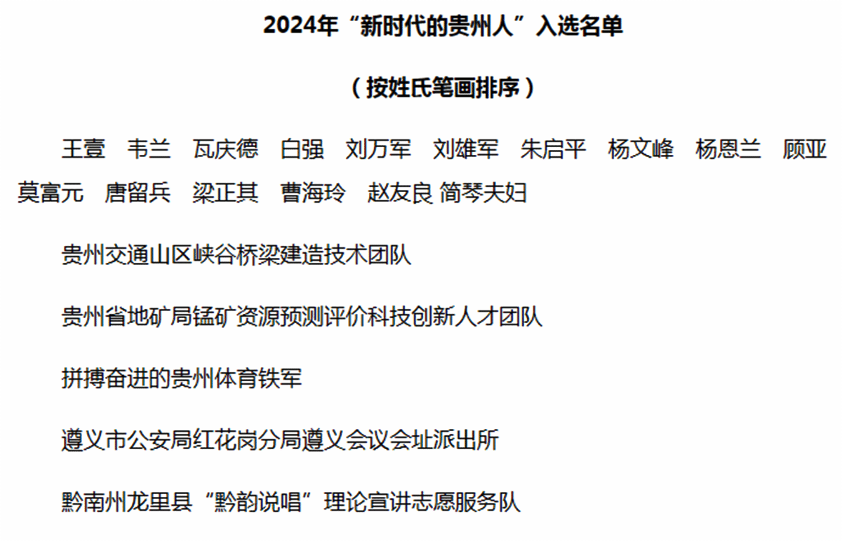 发布仪式通过人物故事短片、现场访谈、文艺演出等形式,展现“新时代的贵州人”先进事迹。发布辞指出,“新时代的贵州人”是全省各行业、各领域、各条战线的杰出代表,他们的事迹感人至深、令人钦佩,他们的优秀品格值得全省干部群众认真学习。要以他们为榜样,坚定理想信念,锤炼能力本领,厚植为民情怀,在破解发展难题、攻克改革难关、维护社会稳定、推动高质量发展等方面不断展现新担当新作为。