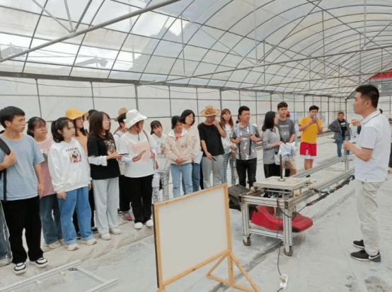 谭智勇(右一)在实践基地给学生讲解漂浮育苗技术
