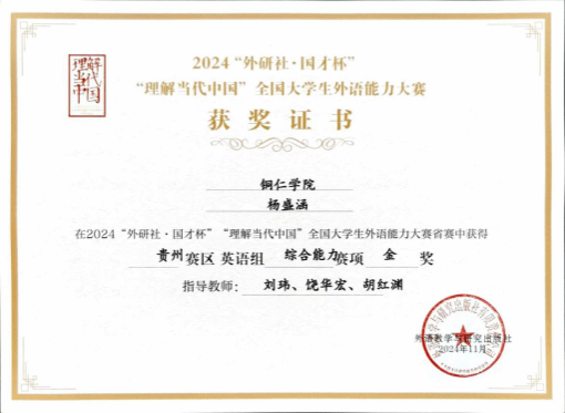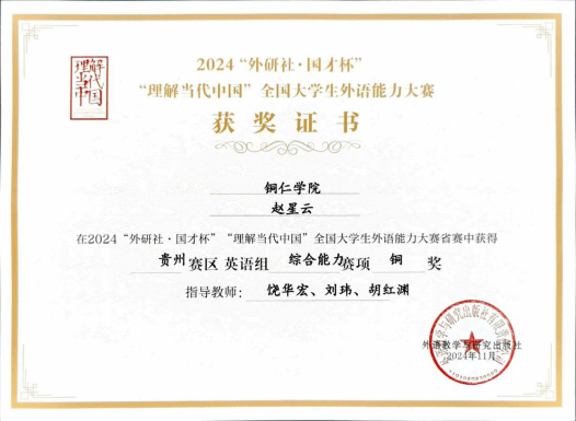 2024年11月2日“外研社·国才杯”“理解当代中国”全国大学生外语能力大赛贵州赛区决赛于安顺学院落下帷幕。beat365杨盛涵 、赵星云2名研究生代表beat365英国官方网站研究生学子参加此项比赛,并取得了1金1铜的好成绩。