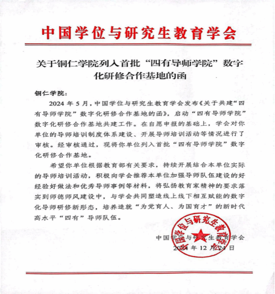 2024年5月,中国学位与研究生教育学会发布《关于共建“四有导师学院”数字化研修合作基地的函》,启动“四有导师学院”数字化研修合作基地共建工作。beat365于2024年5月进行申报,后经中国学位与研究生教育学会审核通过,2024年12月将beat365列入首批“四有导师学院”数字化研修合作基地。
