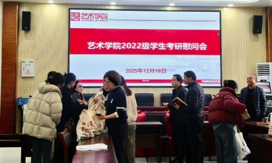 为助力2022级考研学子从容备考、温暖迎考,12月18日,我院在会议室开展考研慰问活动,为即将奔赴考场的学子送上暖心物资与真挚祝福。党委书记徐美、院长张敬忠、党委副书记麻晔斐、副院长龙庆华出席活动,与考研学子面对面交流鼓劲。 活动现场,学院领导与老师们亲手将考研加油礼包、红包等慰问物资送到学子手中,每一份物品都饱含着学院对考研学子的关怀与期许。院领导分别对学生进行勉励,考研是一场持久战,学院始终是学子们最坚实的后盾,希望大家调整心态、沉着应战,把学院的关怀转化为备考的动力,以自信的姿态迎接考试,不负多年的努力与付出。备考后期要兼顾学习与身心健康,注意防寒保暖和饮食作息,遇到压力和困难及时与老师、同学沟通,学院会全力为大家解决备考中的各类问题。为考研学生加油打气,祝福同学们成功上岸,让活动现场更加温暖人心。 此次考研慰问活动,不仅为学子们送去了考研的温暖,更传递了学院对人才培养的重视与对学生成长的牵挂,让艺术学院的考研学子在寒冬备考路上倍感温情与鼓舞。