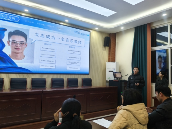 比赛现场,参赛选手围绕自我认知、行业分析、职业目标等维度展开汇报,有的选手以“立志成为音乐教师”为方向,详细规划了深耕专业技能、积累教学经验的成长路径;有的结合艺术行业趋势,制定了短期夯实基础、中期实践进阶、长期深耕领域的分阶段计划。选手展示汇报后,评委老师还针对汇报主题作了提问,测试同学们的现场应对能力。 举办院级选拔赛,主要是以赛促学,帮助学生明确职业方向、提升就业竞争力。通过选拔,推荐白金富、李宗丽、龚灵聪三名同学参加校级比赛。