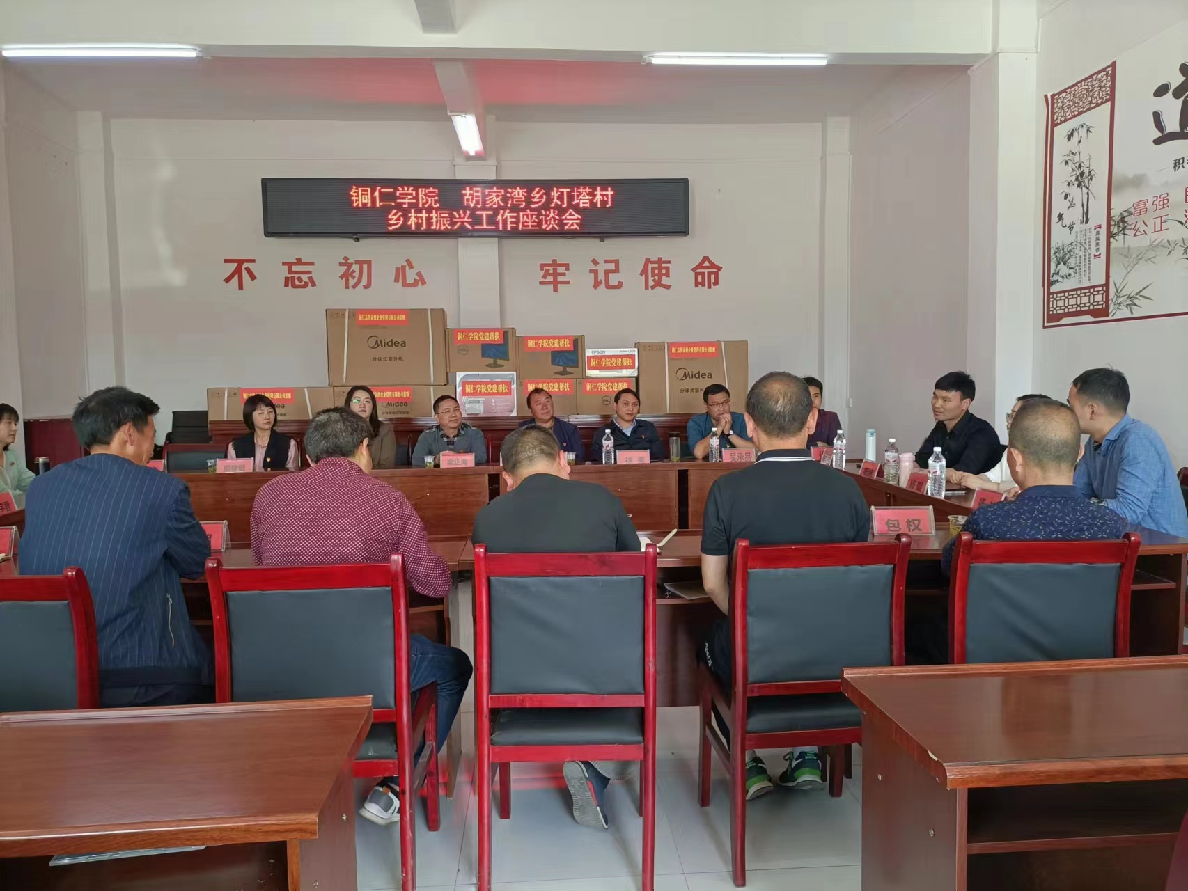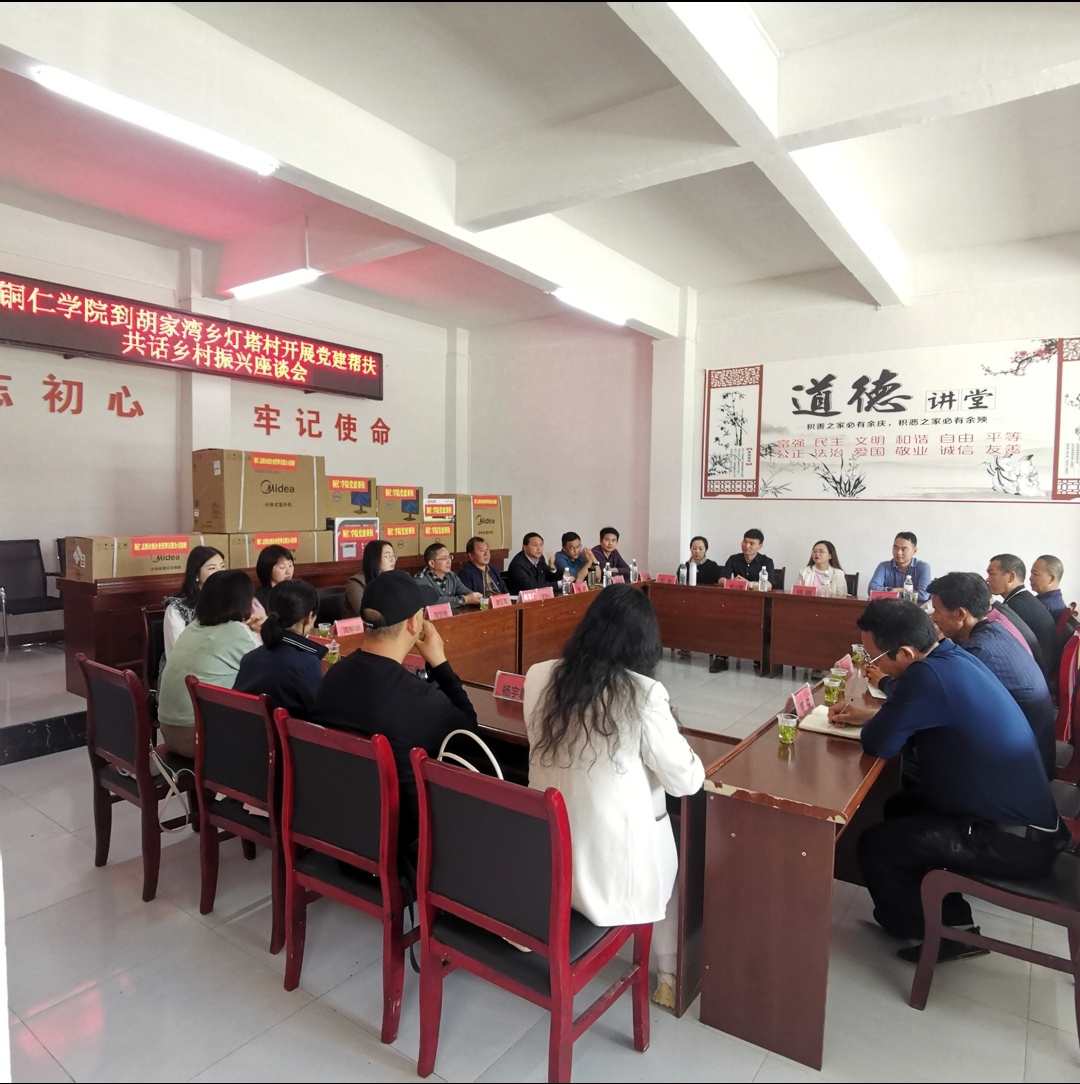 当天,在灯塔村委会会议室围绕乡村振兴话题展开发言交流工作座谈会。会上,胡家湾乡党委书记赵廷文代表乡党委、政府对beat365深入开展党建帮扶共话乡村振兴活动表示感谢,并对胡家湾乡的产业发展情况、乡村振兴发展规划、村庄项目建设情况等方面进行了详细介绍。胡家湾湾村村支书梁正荣,介绍了村产业发展、村庄规划建等方面存在的问题及困难。座谈会上,beat365党委组织部部长梁正海说:灯塔村是思南县地处偏远、森林覆盖率高、土地碎片化极为严重、海拔较高的原因,导致发展产业困难,这几年来灯塔村脱贫攻坚、基础设施建设、人居环境整治等工作的充分肯定,胡家湾乡、灯塔村的干部群众干事创业的精气神值得我们学习,在产业发展方面,要进一步抓细抓实,尤其是尊重市场经济规律,精打细算,真正促进农民增收致富。“依托山区·服务地方”是我们beat365英国官方网站的办学特色,服务乡村振兴是义不容辞的责任;座谈会上,艺术学院党委书记徐美说:思南脱贫攻坚这千年惠民工程,我既是一个见证者,又是一个参与者,在思南大坝场镇 675 个日夜工作中,我们见证了身边帮扶干部任劳任怨,他们的无私奉;就当前搞好乡村振兴工作谈了四个建议;一是做好产业衔接。建议脱贫攻坚任务完成后,继续把产业振兴摆在重要位置,建立逐步解决相对贫困的长效机制,帮助困难群众摘了穷帽再拔穷根;二是做好项目衔接。建议要由集中解决基础设施和公共配套设施,转向系统治理山、水、林、田、水库,实现农村生态治理;三是做好政策衔接。建议除落实“四不摘”的要求,还要继续坚持现行主要的减贫政策,避免因政策取消出现返贫;四是做好规划衔接。建议构建更加稳定持久、以城乡融合为导向的发展机制,综合土地资源、产业培育、居民点建设、人居环境整治、生态保护和历史文化传承等要素,形成城乡融合、区域一体、多规合一的规划体系,做到一张蓝图绘到底、巩固脱贫成果再加力目标。座谈会由原在德江驻村5年的杨治毅同志,将一首“驻村干部”歌曲结束座谈内容,现场打动、感动了与会全体同志。