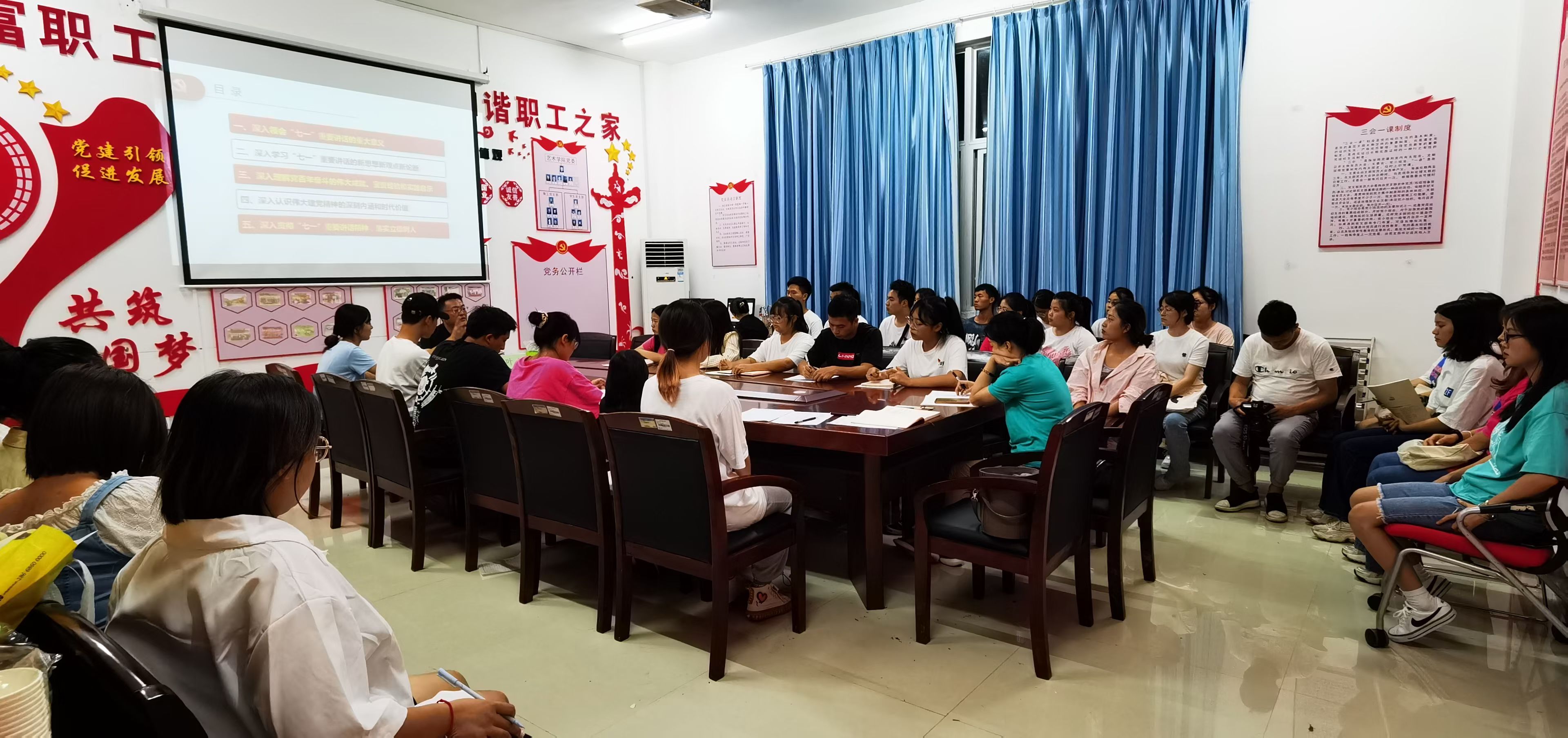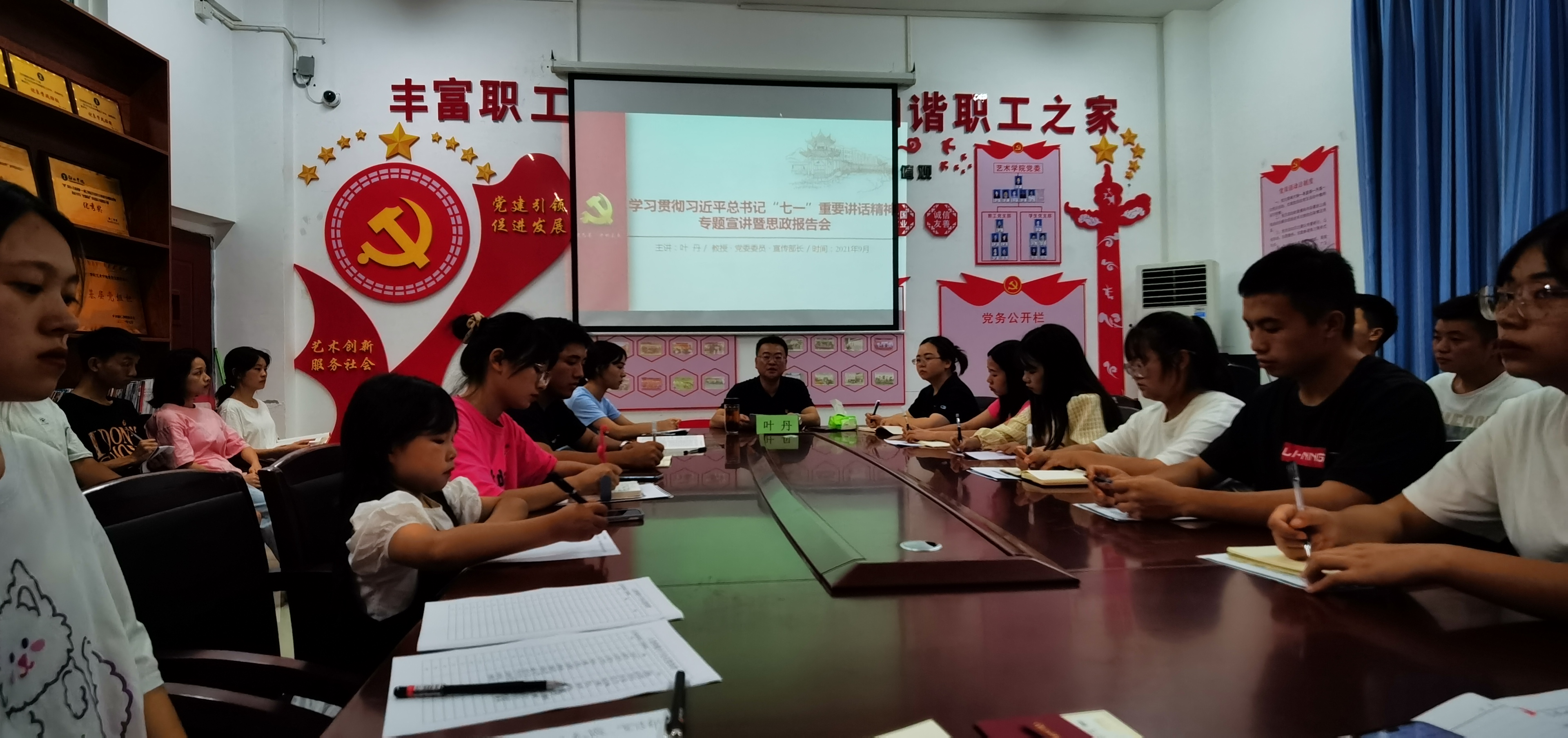为引导我院党员及入党积极分子深刻领会和准确把握习近平总书记“七一”重要讲话精神的重要意义、丰富内涵和核心要义。艺术学院于9月13日晚19:30在美术楼党员活动室开展了学习贯彻习近平总书记“七一”重要讲话精神专题宣讲暨思政报告会。此次会议由beat365英国官方网站党委委员、宣传部部长叶丹教授主讲,艺术学院党委副书记麻晔斐、教工支部书记符玲、学生党支部书记杨璐出席,艺术学院正式党员、预备党员、入党积极分子聆听。