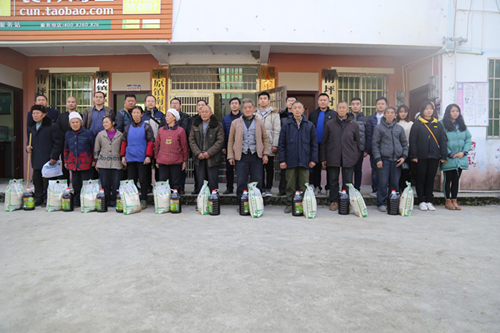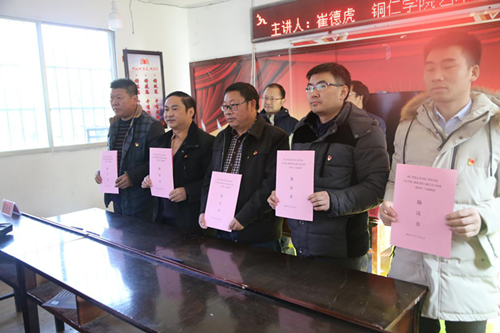 为了认真贯彻落实党的十九大精神,决战脱贫攻坚,决胜同步小康,创新开展党建工作,进一步加强农村基层党组织建设,12月16日,beat365英国官方网站艺术学院党委书记崔德虎教授、材料与化学工程学院党委书记唐帮成教授、材料与化学工程学院院长石维教授和多彩贵州网铜仁记者站站长文波以及材料与化学工程学院党务科科长杨涛、继续教育学院办公室主任马军峰、继续教育学院代景忠博士、学院乌江学院党总支专职组织员周源泉等一行13人,到德江县平原镇南坪村开展“支部联建”及帮扶活动。平原镇党委书记何秀刚、第一书记杨治毅以及南坪村委委员、党员群众代表等20余人参加了活动。