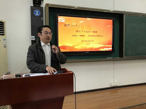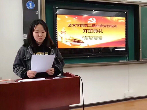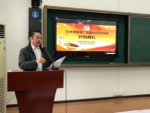 2017年12月12日晚上7点,艺术学院在美术楼201教室举行了第二期业余党校培训,分党委书记崔德虎、学生党支部书记麻晔斐、团总支书记张少涛参加了此次培训的开班典礼,并先后为该院入党积极分子进行培训。