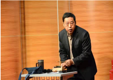 讲座中,戴腾教授首先对拉唱的戏曲老师们进行介绍,接着讲述了戏曲的发展历史以及风格种类,使同学们对戏曲先有了大致了解。紧接着戴腾教授阐述了京剧中“四功五法”的含义,围绕“声腔艺术”对京剧艺术腔体进行解析,并将“皮黄、板眼”示范给同学们听。讲解过程中戴腾教授边说边唱、边唱边敲,以声带形将同学们带入京剧声腔艺术的世界里,同学们沉醉其中、忘乎所以。随后戴腾教授邀请到场的戏曲老师们以三国中的龙凤呈祥、霸王别姬等经典片段为典例为同学们进行表演示范,表演过程中,戏曲老师们唱做俱佳、韵味十足,令同学们赞叹不已。