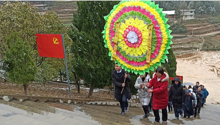 21日上午,“采风团”到达石阡县石根坡红二、六军团先遣队会师地,先在会师纪念馆参观会师史实图文、实物展,听纪念馆工作人员详尽、深情讲解红二、六军团先遣队会师故事。随后,又踩着积雪,登上石根坡,展望历史,感受红军会师现场的热烈气氛和背后艰辛。下午,“采风团”一行到达石阡县困牛山村,参访困牛山战斗遗址,身临红52团集体跳崖处,通过听取讲解、现场踏勘的方式,感受红52团生死之际,以对党的忠诚、对人民的爱戴之情舍生取义,集体跳崖,以保全百姓的浩然英气。最后,“采风团”来到困牛山烈士纪念碑参观,向红军英烈敬献花圈,默哀缅怀。